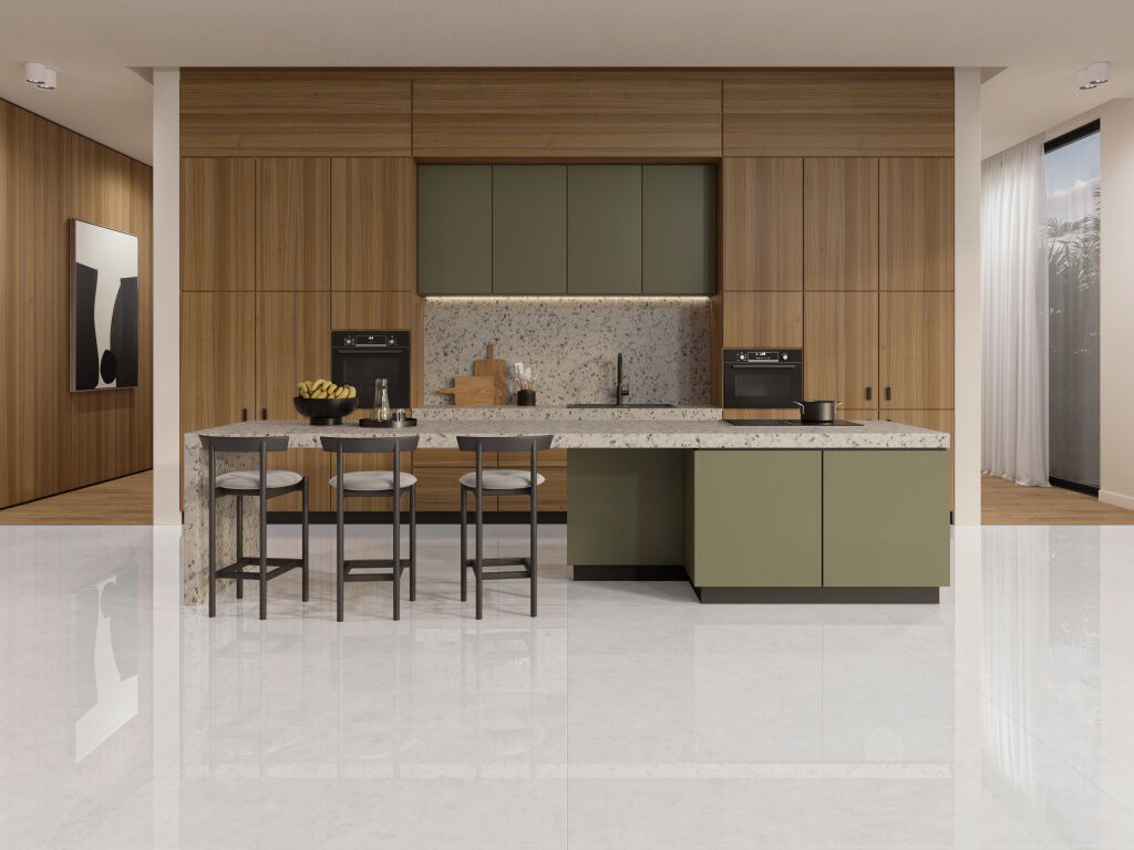 Cocina estilo contemporaneo con producto aplicado: Heartwood Brandy 18.5x150, Marabilia Crystal White 80x160 pulido en formato extra grande, con una tendencia de color cálido-oscuro con apariencia de madera y mármol en acabado brillante.