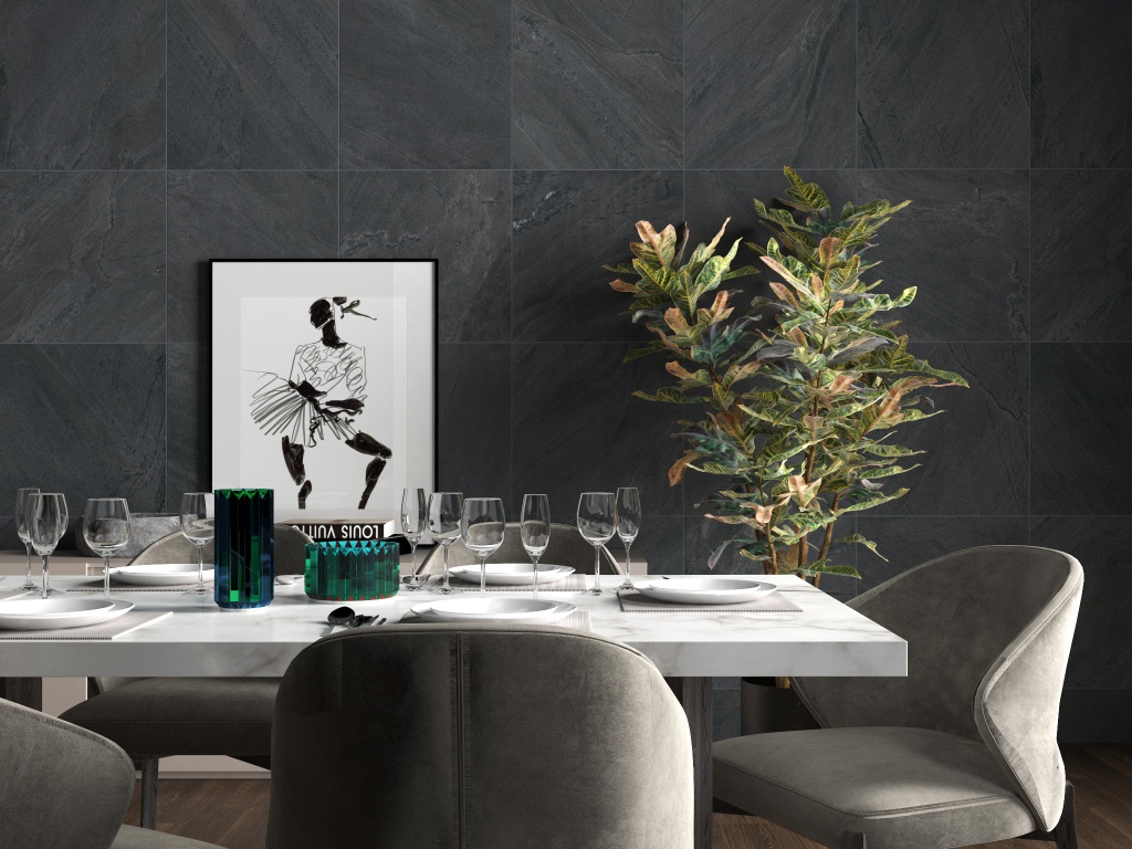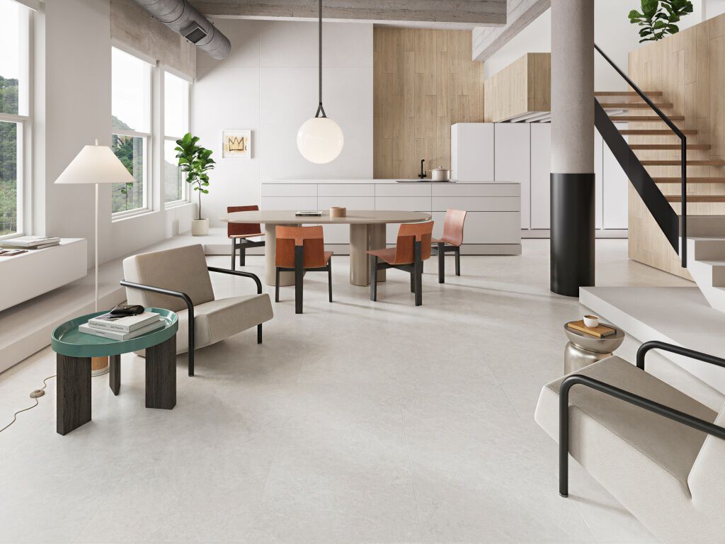 Comedor estilo contemporaneo con producto aplicado: Creato Ivory 60x120 y Luminova Perlato 60x120 en formato extra grande, con una tendencia de color cálido-claro con apariencia de mármol en acabado mate-satín.