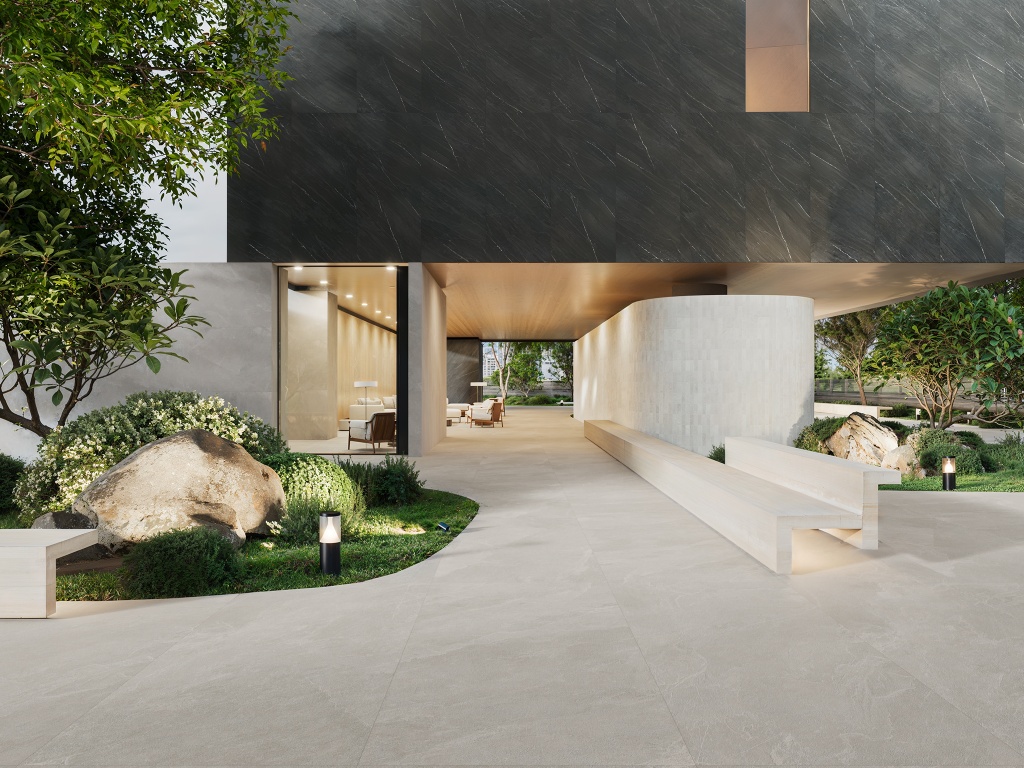 Exterior estilo contemporaneo con producto aplicado:Kalio Slate 60x60 en formato grande, con una tendencia de color frío-claro con apariencia de granito y piedra en acabado mate-satín.