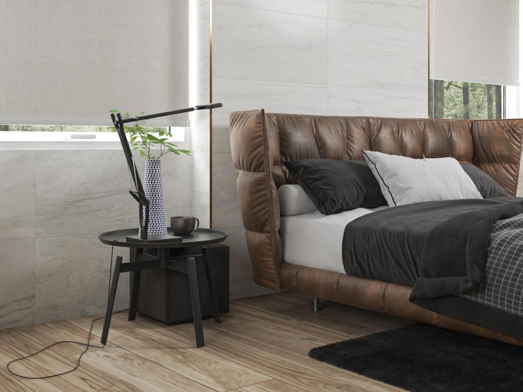 Recámara estilo contemporaneo con producto aplicado: Elara Silver 60x120 en formato extra grande, con una tendencia de color cálido-oscuro con apariencia de mármol en acabado brillante.