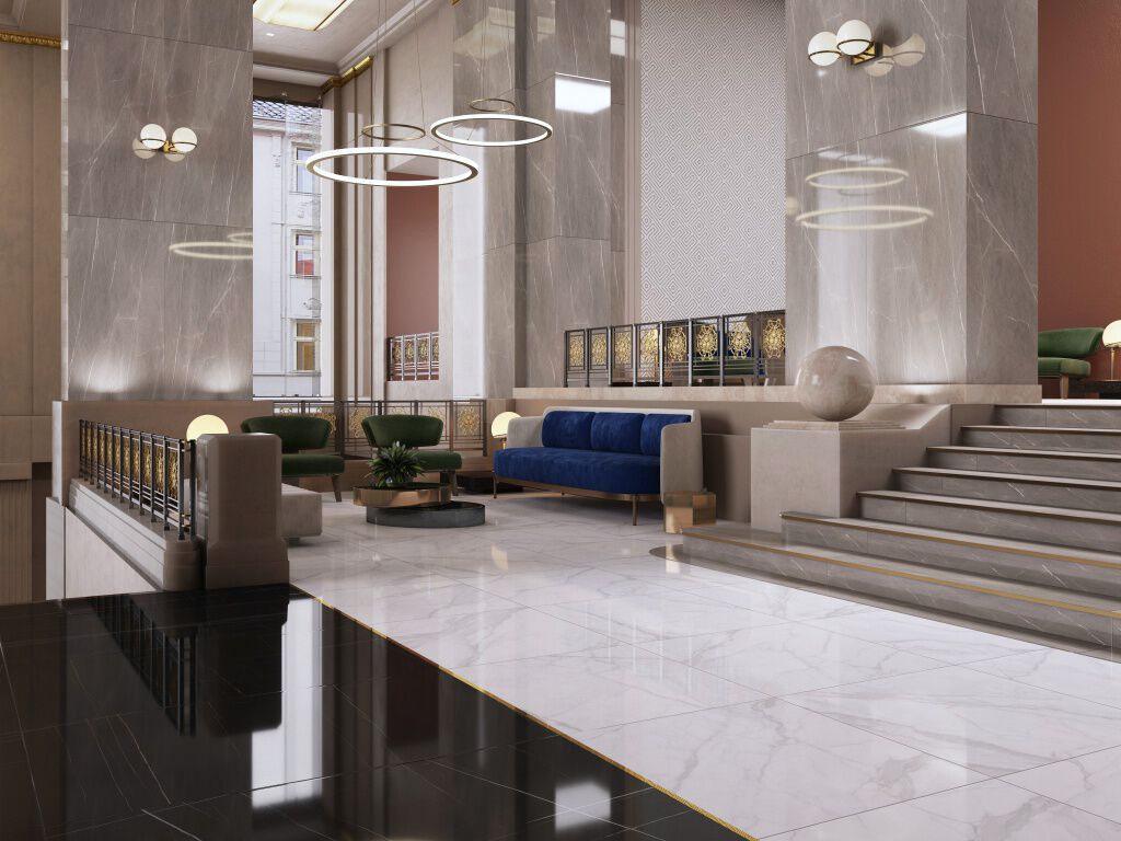 Comercial estilo clásico con producto aplicado: Form Remy White 20 x 20, Marble Slab Calacatta 90 x 90, Marble Slab Pulpis 90 x 180 y Marble Slab Sahara Noir 90 x 180 en formato chico, grande y extra grande, con una tendencia de color cálida y clara y apariencia de mármol en acabado brillante.